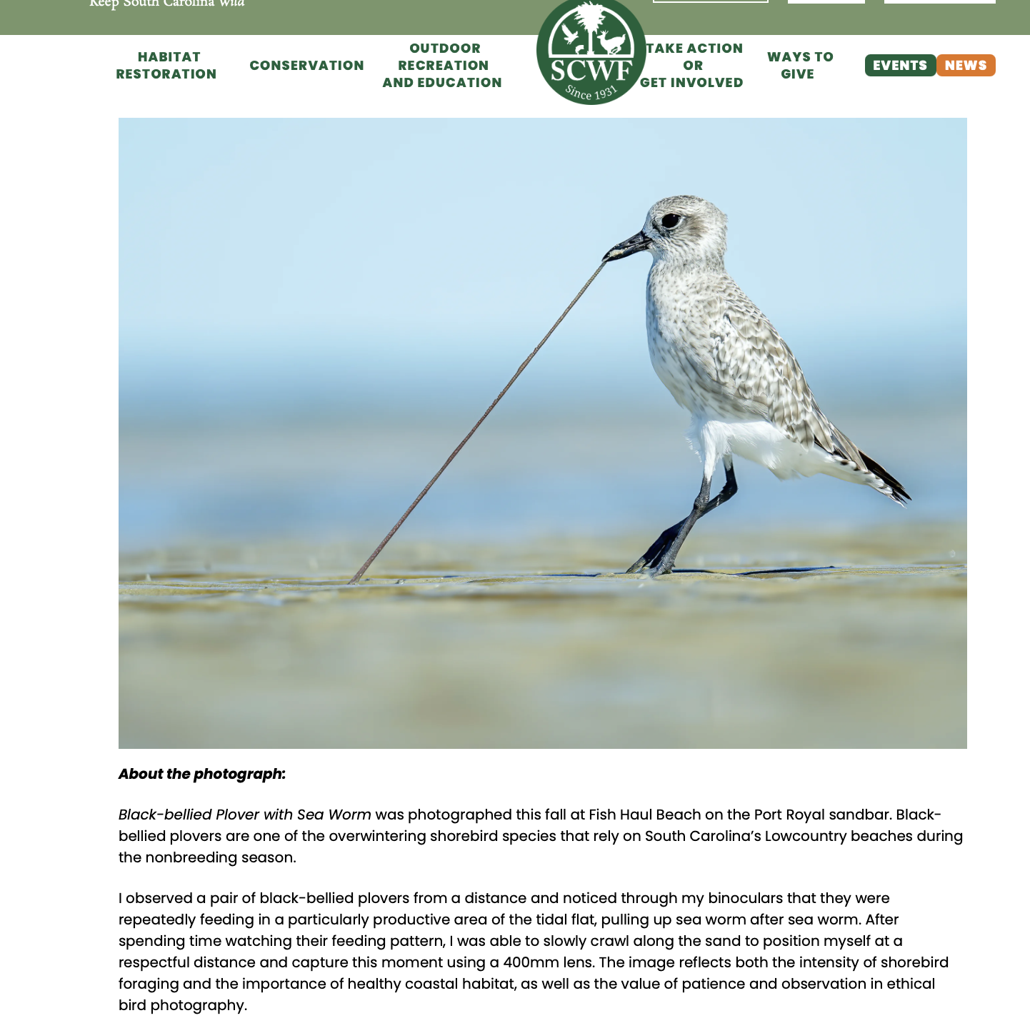 First Place Winner, Carolina Critters Category — South Carolina Wildlife Federation’s 2025 Wildlife Photography Contest for my image Black-bellied Plover with Sea Worm. This recognition reflects a commitment to ethical wildlife photography grounded in careful observation, patience, and respect for place, capturing an intimate coastal moment that celebrates the behaviors and beauty of South Carolina’s shorebirds.