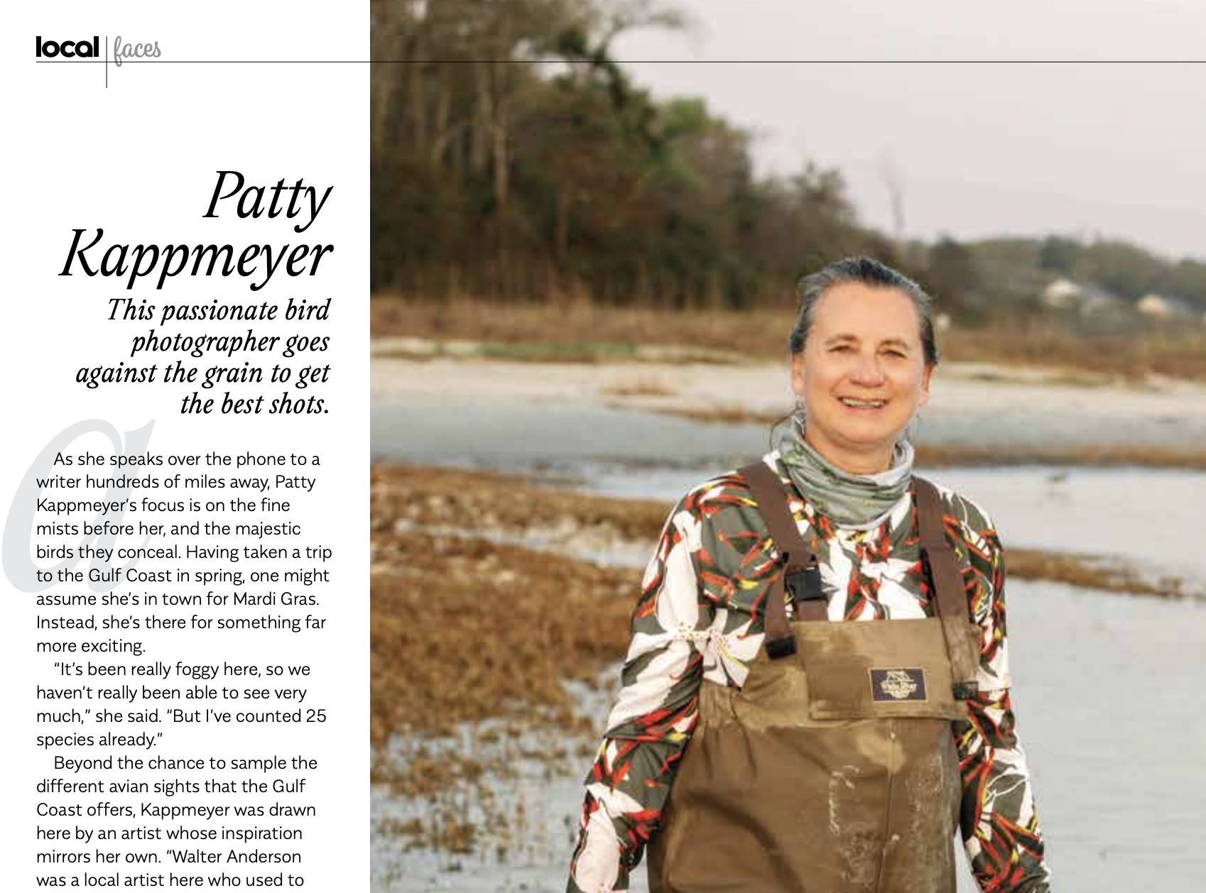 “Have you ever noticed that living in the Lowcountry brings out the “inner birder” of its residents? Thirty years ago, Patty Kappmeyer had no idea that her greatest joy would one day be photographing Hilton Head’s graceful shorebirds or that her photos would decorate website and magazine pages. “I am happiest taking photos, wandering through the marshes and forests, plodding through pluff mud,” says Patty. Browsing through her Facebook pages, Patty’s birds are identified, often accompanied by a story. An Audubon board member and editor for Ecoban newsletter, she also writes a monthly column, “Feathers Through our Lenses.” Whether a new or seasoned birder, Patty’s tales and stunning photographs will deepen your appreciation of Lowcountry birds.