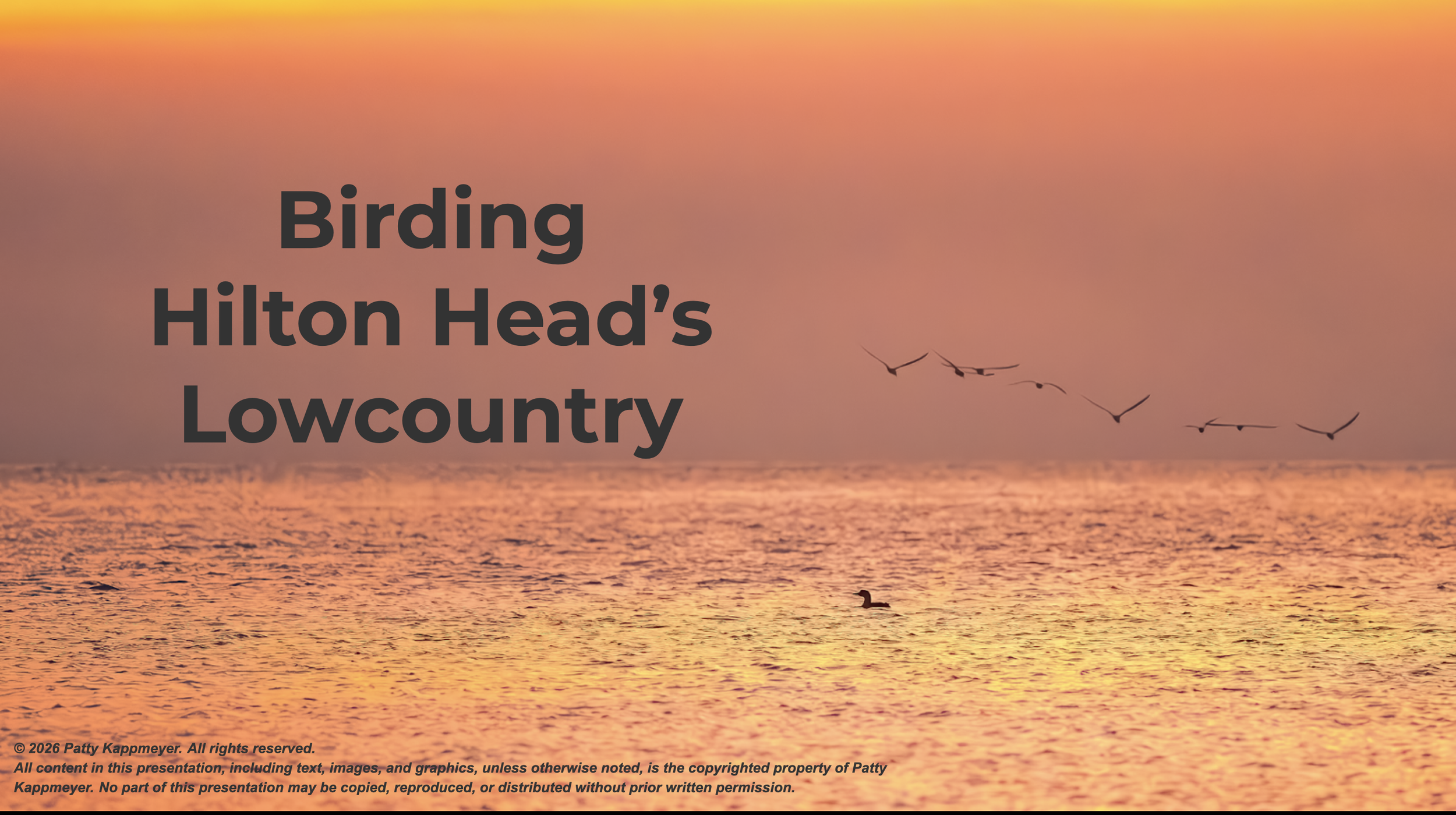 Bring the beauty and wonder of Hilton Head Island’s birdlife and wild places to your next event with Patty Kappmeyer—birder, wildlife photographer, and nature writer. With more than thirty years of field experience exploring the marshes, forests, and coasts of the Lowcountry, Patty delivers inspiring, visually rich presentations for civic groups, conservation organizations, photography clubs, educators, and community gatherings of all sizes.